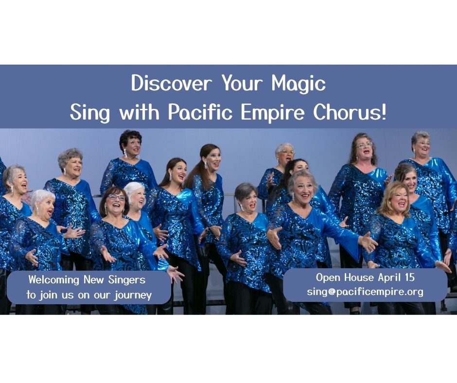 Pacific Empire Chorus is the premier northern California women’s, 4-part a cappella, award winning mid-sized chorus. PEC is a 501c(3) organization, dedicated to bringing a cappella harmony, to women of all ages throughout Sonoma, Marin and Napa counties. Experience the love of harmony, friendship and singing that we share each week. Pacific Empire Chorus is affiliated with the international women's singing organization Sweet Adelines International. We are a part of Pacific Shores Region 12, which covers Northern California, Northern Nevada, Southern Oregon and Hawaii.In 2024, PACIFIC EMPIRE CHORUS CELEBRATED ITS 60 YEAR ANNIVERSARY THIS YEAR.